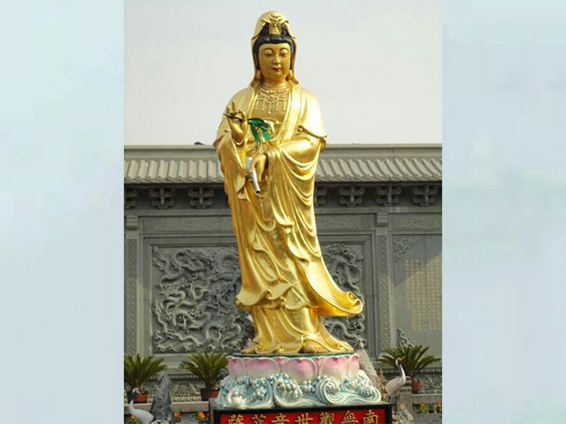 采用鑄造工藝將銅鑄成觀音像形象,表面采用鎏金、貼金、上色等等客戶要求的工藝進(jìn)行處理。